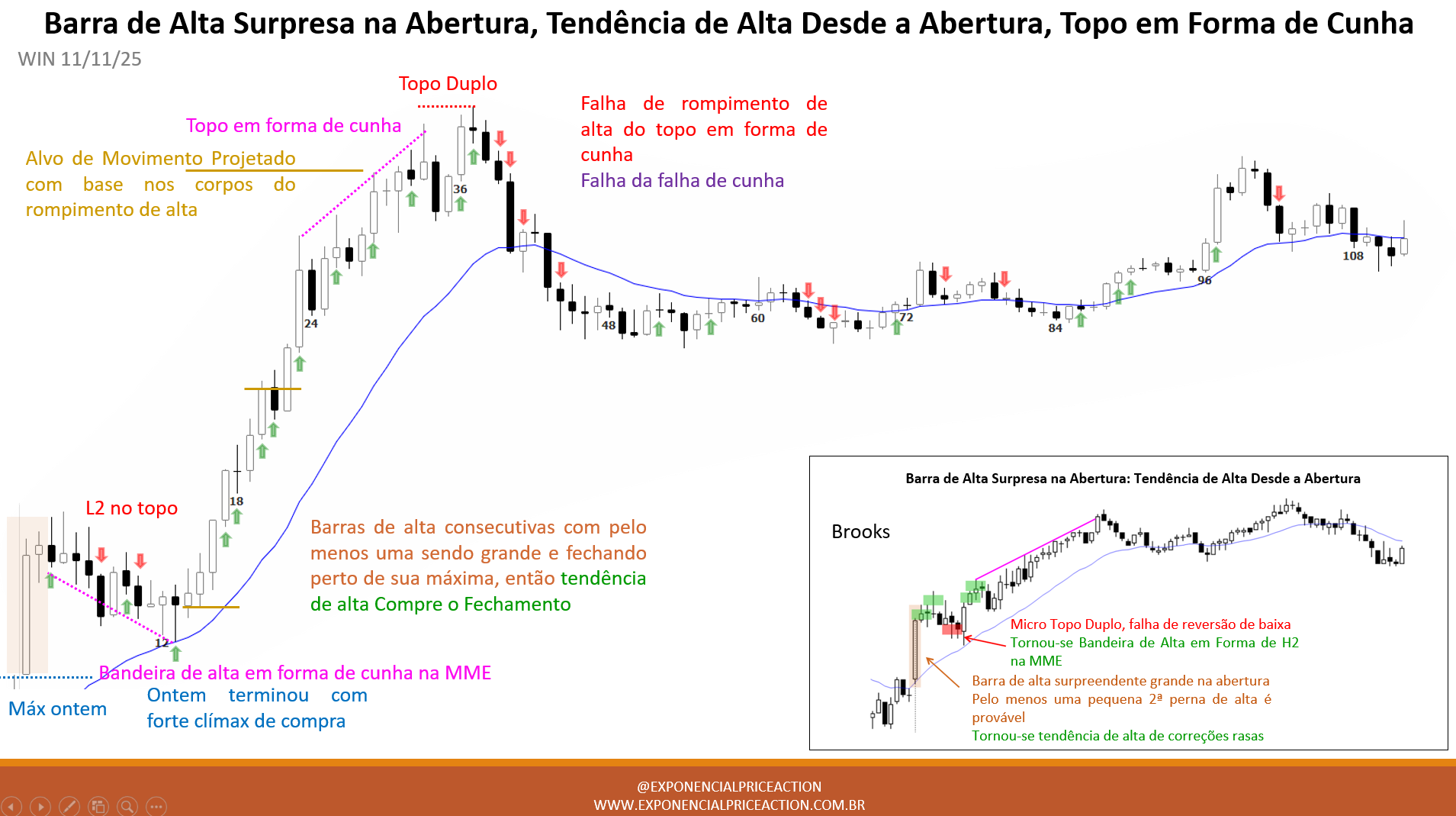 O pregão de 11/11/25 começou com uma forte barra de alta surpresa logo na abertura, sinalizando um possível dia de tendência de alta desde o início.
