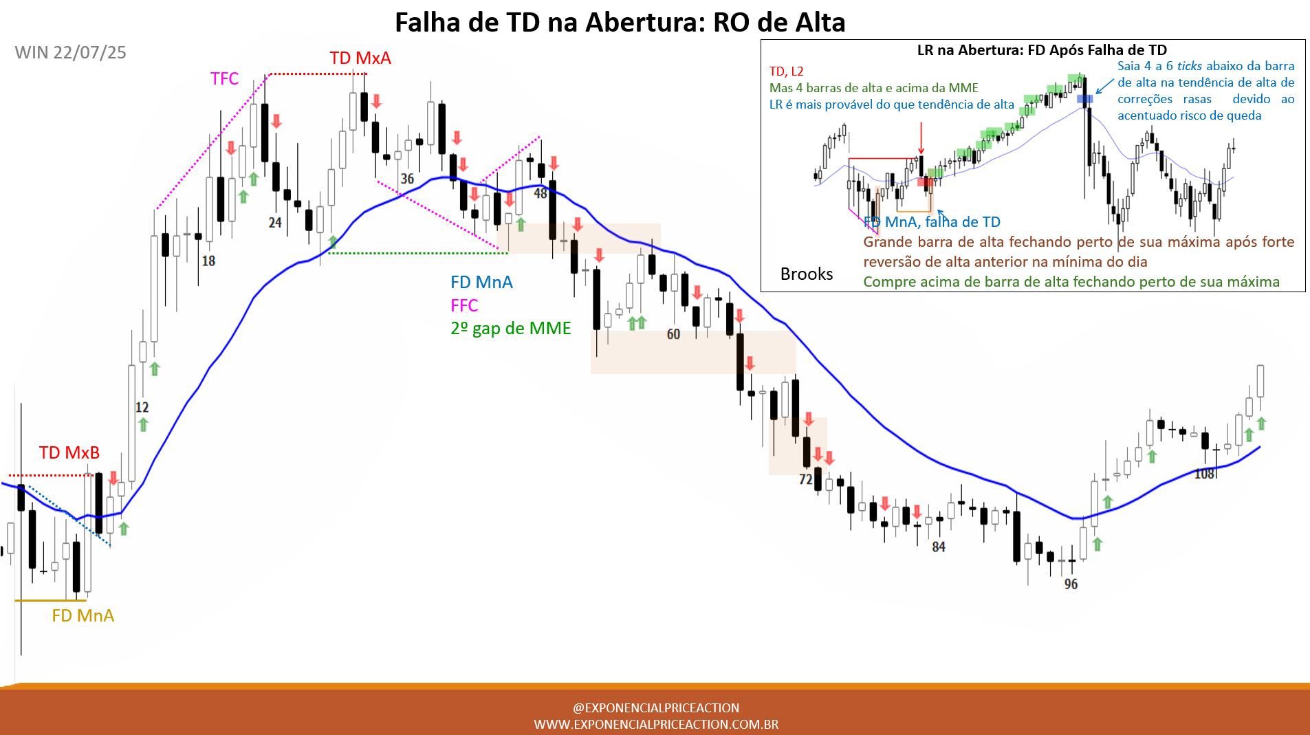O dia começa com uma tentativa de topo duplo mais alto (TD MxB) que falha, gerando uma reversão majoritária de alta (FD MnA).