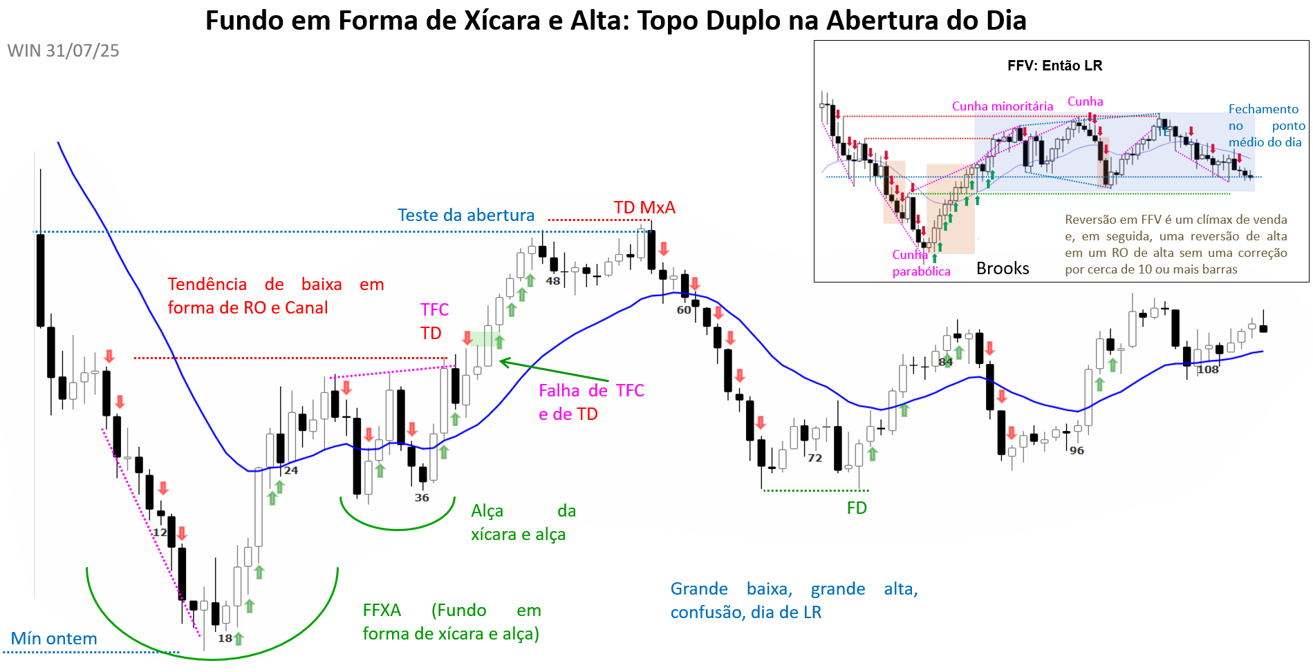 O dia iniciou com forte movimento de baixa, configurando uma tendência de baixa em forma de RO e canal logo após a abertura. Próximo à mínima, formou-se um Fundo em Forma de Xícara e Alça (FFXA), sinalizando reversão para alta. O rompimento da “alça” confirmou a mudança de direção, levando a um movimento de alta consistente.
