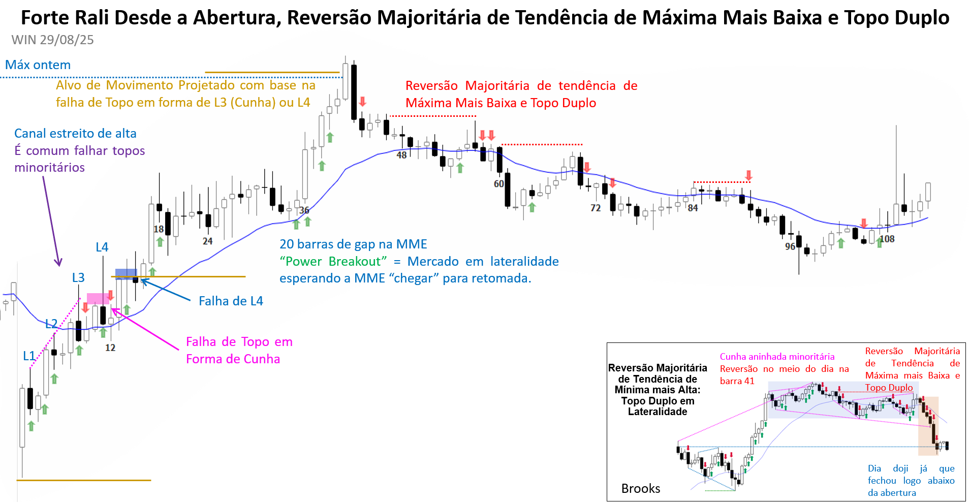 O gráfico do WIN 29/08/25 traz um pregão bem didático em termos de ciclos de força, lateralidade e reversão majoritária. Ignorando a parte dentro do retângulo (análise do Brooks), aqui vai uma leitura robusta: