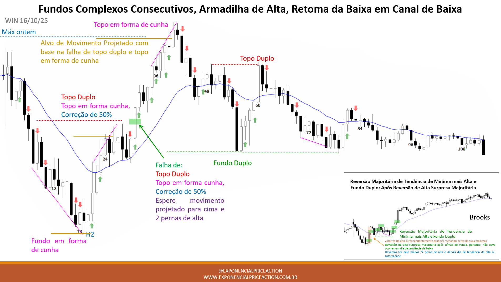 A combinação de clímax de venda + H2 forte + alta surpresa é um dos sinais mais confiáveis de reversão de tendência segundo Al Brooks.
