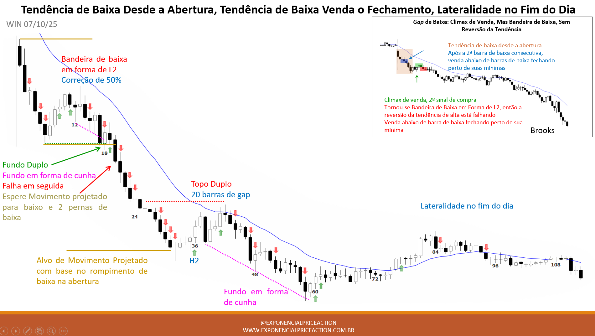 Em tendência de baixa forte, fundos em forma de cunha geralmente rendem scalps de compra, não reversões sustentadas. A ausência de continuidade altista após a barra de rompimento reforça isso.