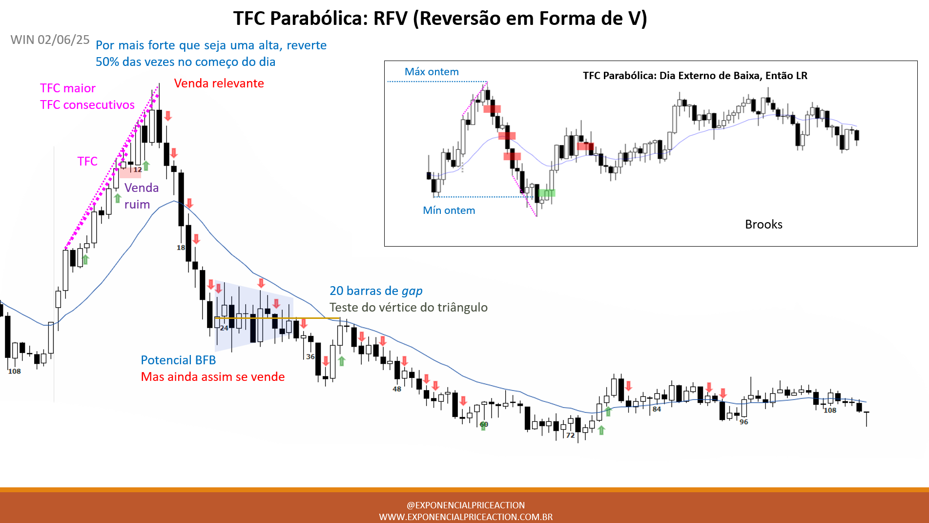 Aqui estão alguns setups razoáveis, com entrada por ordem stop. Mostro cada barra de entrada de compra com uma seta verde e cada barra de entrada de venda com uma seta vermelha. Os mentorados que me acompanham têm acesso à análise mais detalhada deste e de outros ativos diários com explicações mais detalhadas sobre setups de operações de swing. Os membros da mentoria tem acesso ao Recap com a explicação detalhada gravada em aula e tabmém ao PDF produzido com pelo menos 3 ativos (WIN, WDO e BITFUT). Meu objetivo com estes gráficos é apresentar uma perspectiva de “Modo Sempre Posicionado”. Se um trader estivesse tentando estar “Sempre Posicionado” ou quase “Sempre Posicionado” em uma posição o dia todo, e não estivesse no mercado, essas entradas seriam momentos lógicos para ele entrar. Portanto, são entradas de potencial swing. É importante entender que a maioria dos setups de swing não leva a operação de swing. Assim que os traders se decepcionam, muitos saem. Aqueles que saem preferem sair com um pequeno lucro (scalp), mas muitas vezes precisam sair com um pequeno prejuízo. Se o risco for muito grande para sua conta, você deve esperar por negociações com menor risco ou negociar em um mercado alternativo.