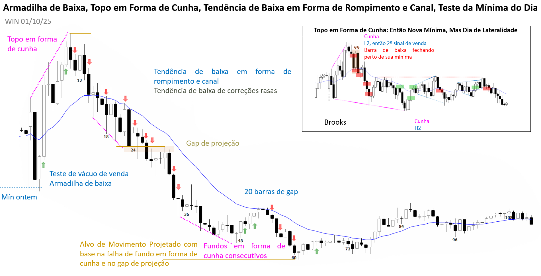 A 2ª barra perfurou para baixo (teste da mínima de ontem) e reverteu para cima, deixando os vendedores presos: armadilha de baixa típica de abertura.